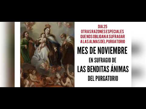 Oh María, Madre de misericordia: acuérdate de los hijos que tienes en el purgatorio y, presentando nuestros sufragios y tus méritos a tu Hijo, intercede para que les perdone sus deudas y los saque de aquellas tinieblas a la admirable luz de su gloria, donde gocen de tu vista dulcísima y de la de tu Hijo bendito.